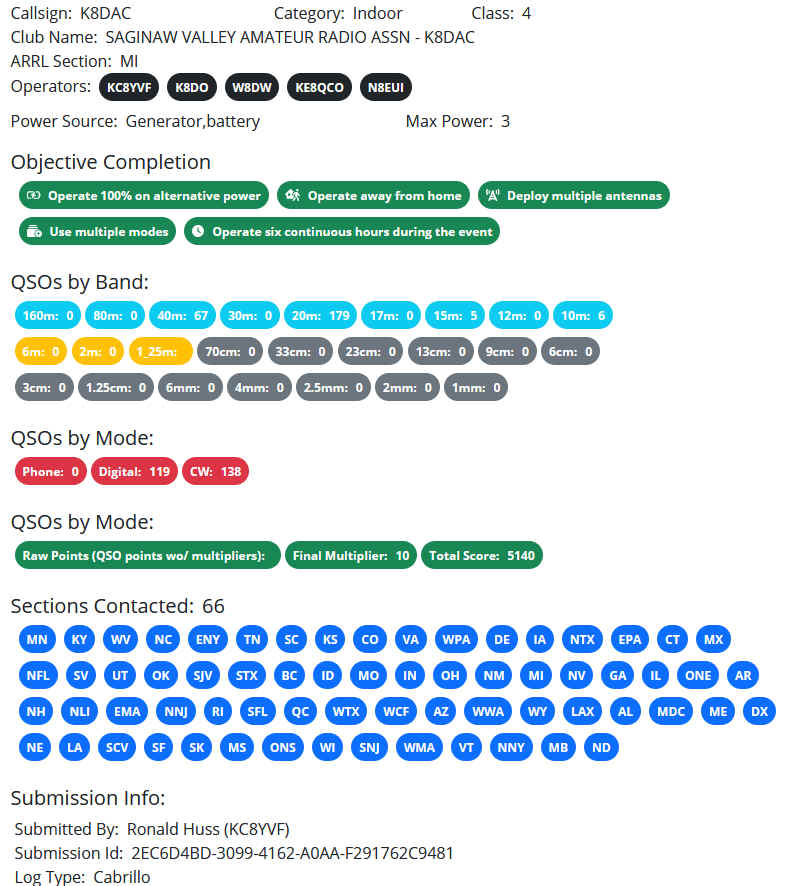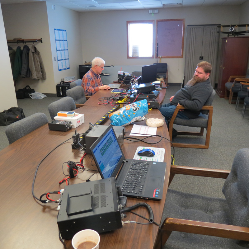 2025. The official rules can be found at Winter Field Day web site and the event is open to all amateurs. NOTE: antenna setup area will be next to the west side of the airport terminal building. Will can utilize the fence post for attaching our antenna lines. Operators please keep this in mind when determining your best solution for your antenna setup. Setup will begin at 9 AM. Operators: CW - Dennis, K8DO, Dave W8DW All computers were running N3FJP's Winter Field Day logging software networked together using a Dell laptop and a Dlink wireless router. Total Submitted Results: Total Contacts = 257 Contacts: SOAPBOX Points Log Submitted: WFD Log File Official Results:
