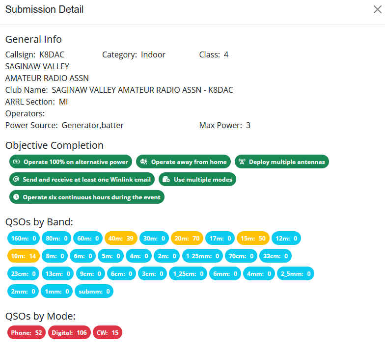 2026. The official rules can be found at Winter Field Day web site and the event is open to all amateurs. NOTE: antenna setup area will be next to the west side of the airport terminal building. Will can utilize the fence post for attaching our antenna lines. Operators please keep this in mind when determining your best solution for your antenna setup. Setup will begin at 9 AM. Operators: SSB - Ron KC8YVF All computers were running N3FJP's Winter Field Day logging software networked together using a Lenovo laptop and a Dlink wireless router. Total Submitted Results: Log Submitted: WFD Log File Official Results: Total Contacts = 173 Contacts: SOAPBOX Points